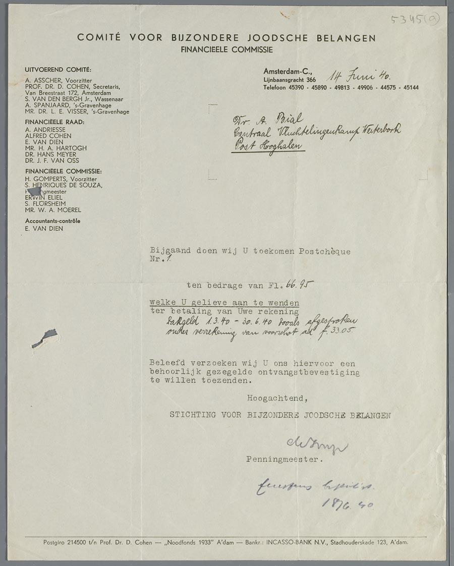 Brieven (3) van het Comité voor Bijzonder Joodse Belangen met mededelingen over de maandelijkse vergoeding die Arthur Bial die (als vreemdeling) in kamp Westerbork verblijft, krijgt voor zijn werk als arts in het kamp, maart-juni 1940