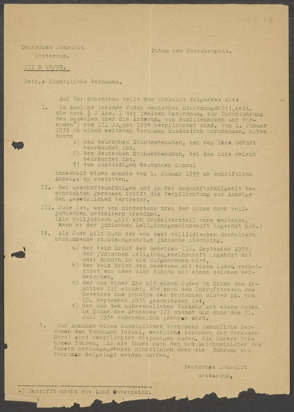 Circulaire m.b.t. verplichting voor Duitse joden die in het buitenland verblijven om een tweede voornaam aan te nemen per 1 januari 1939