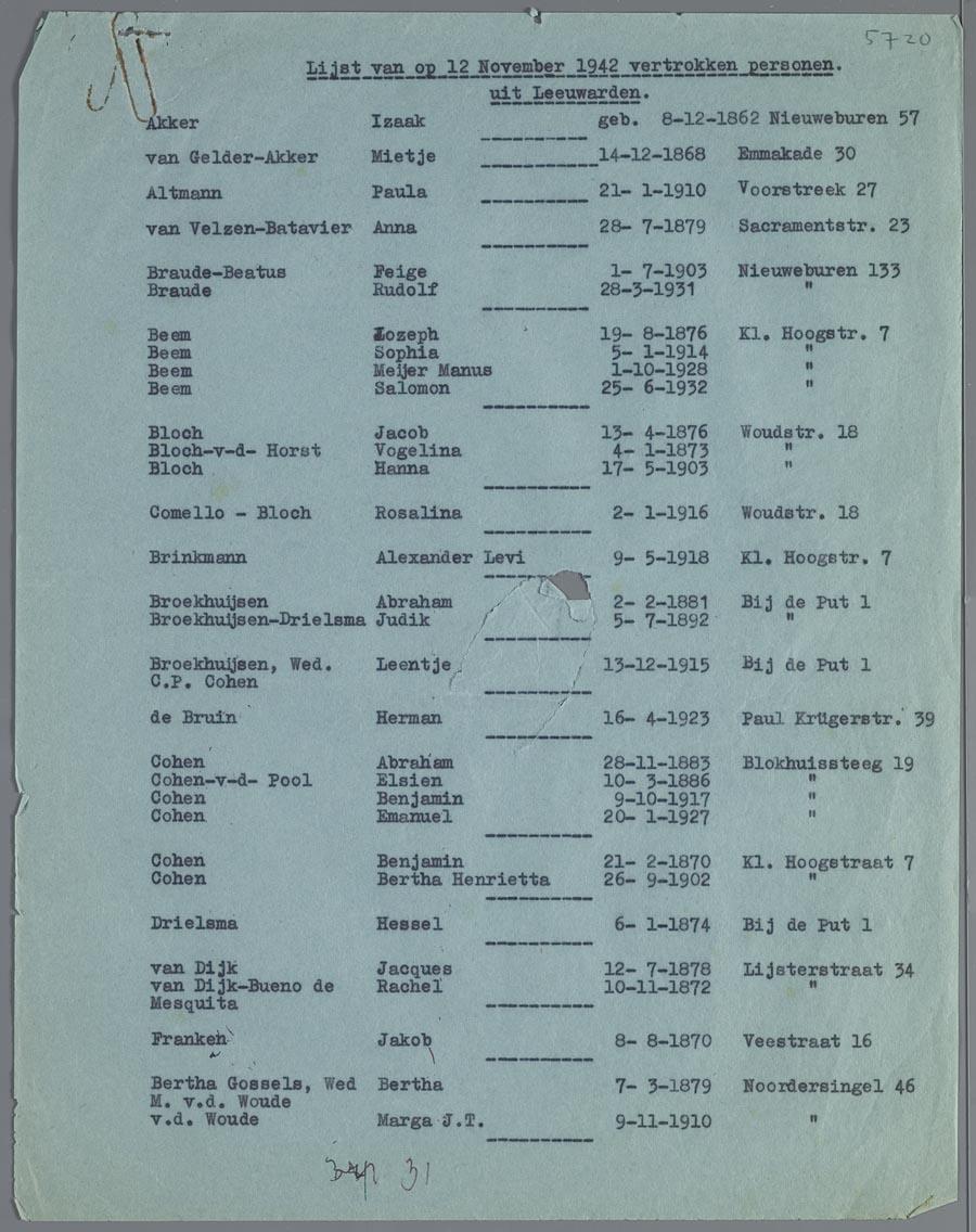 Lijst met namen, geboortedata en adressen van ruim 120 joden die op 12 november 1942 vertrokken zijn uit Friesland