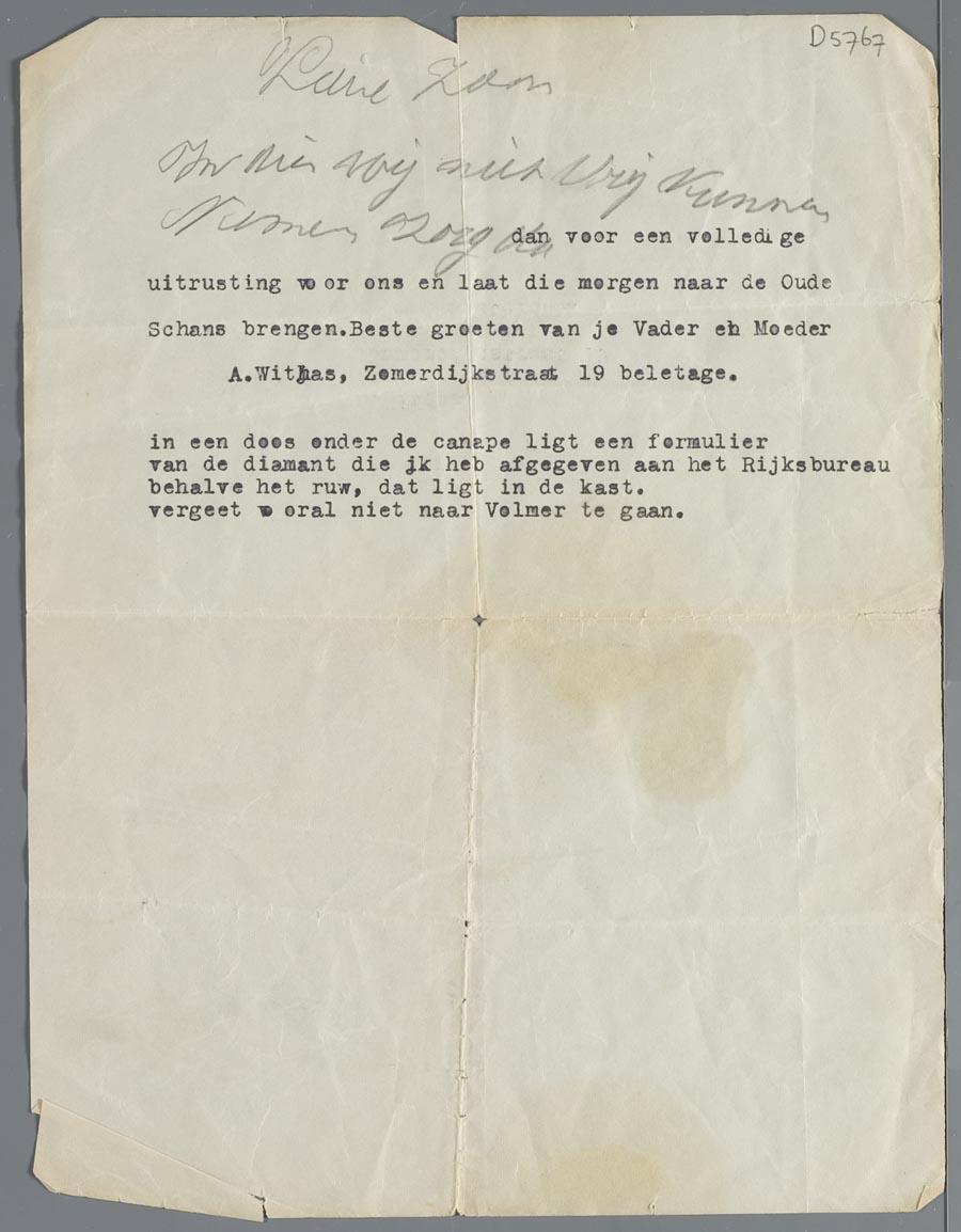 Het gezin Witjas woonde op de Zomerdijkstraat 19 bel-etage. Met de 'Oude Schans' wordt de afdeling 'Hulp aan Vertrekkenden' van de Joodse Raad (Oude Schans 74), of een onderafdeling van deze afdeling, de 'Bagage-afdeeling' (Oude Schans 92) bedoeld. Ook wijzen de ouders hun zoon op een 'formulier van de diamant', waarmee waarschijnlijk de aanmeldingsformulieren van diamantbewerkers worden bedoeld, en het 'Rijksbureau', waarmee het Rijksbureau voor Diamant wordt bedoeld. Opmerkelijk aan dit document is dat zowel Abraham als Judith geen zoon had aan wie dit gericht zou kunnen zijn.