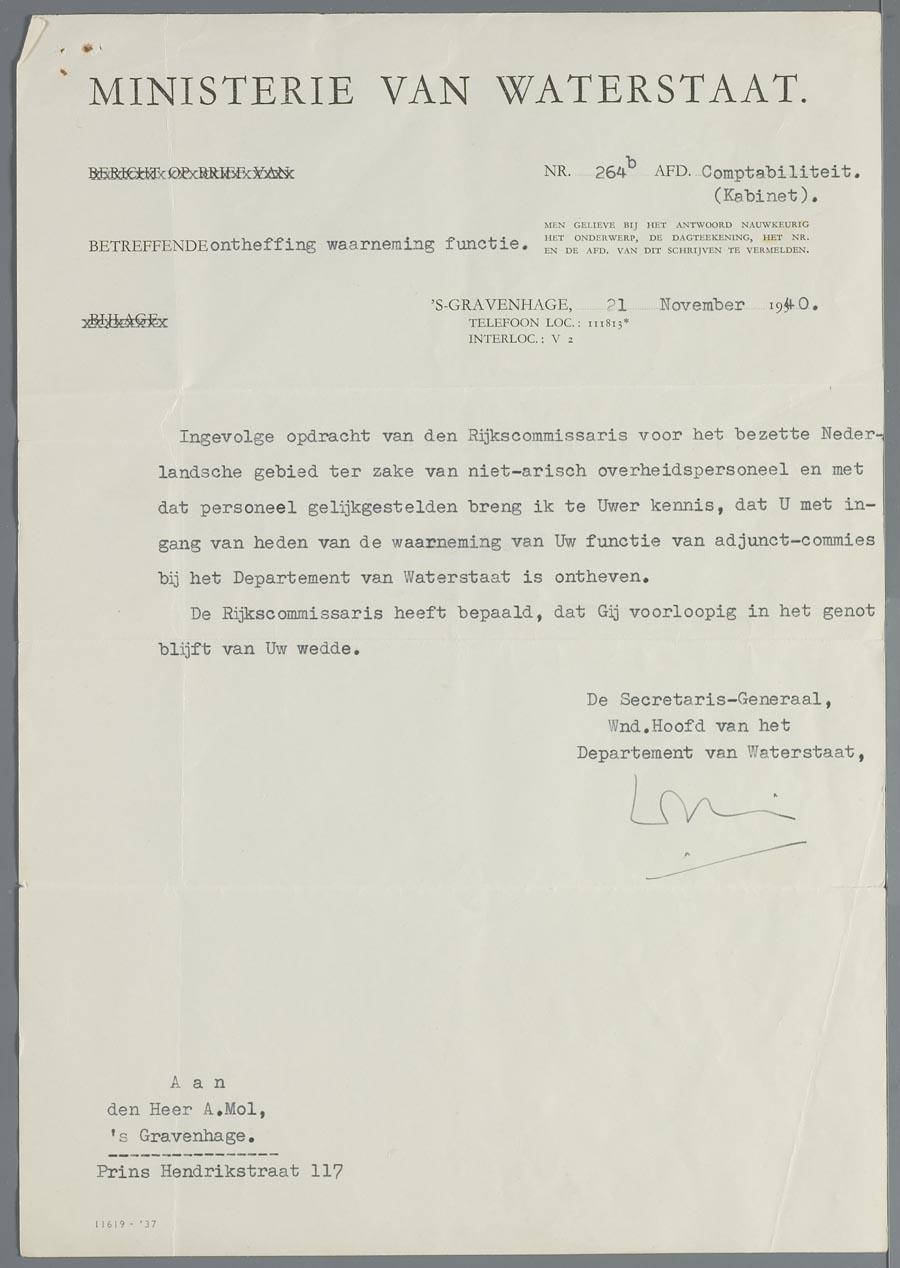 Brief van het Ministerie van Waterstaat aan Abraham Mol in Den Haag met de mededeling dat hij, als jood, ontslagen wordt als adjunct-commies, november 1940