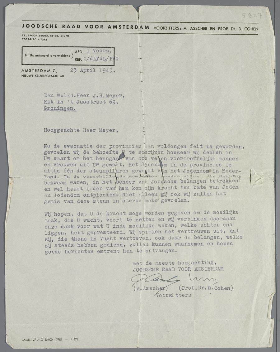 Brief van de voorzitters van de Joodse Raad aan Jacob Herman Meijer, vertegenwoordiger van de Joodse Raad in Gronigen, april 1943