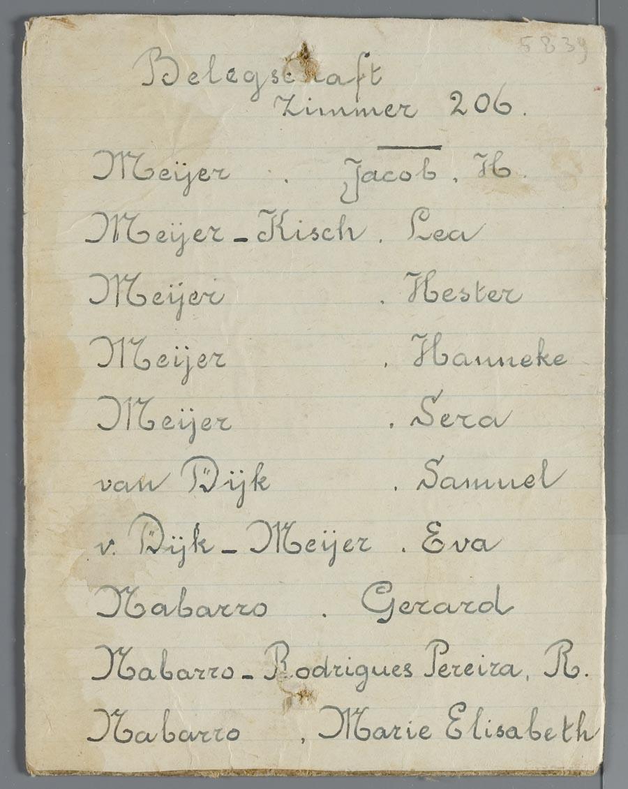 Handgeschreven naamlijst van bewoners van kamer 206 in Theresienstadt. In het dagboek van Jacob Herman Meijer (D0005839) wordt deze kamer beschreven. Hij schrijft dat Zimmer 206 onderdeel uitmaakte van de Hamburger Kazerne, een van de gebouwen in kamp Theresienstadt. Meijer en gezin werden daar gevangen gehouden sinds 18 januari 1944. Meijer schrijft dat zij op 10 juni 1944 terecht kwamen in deze kamer 206, die diende als een van de zogenaamde “show rooms”. Op 23 juni 1944 bezocht een delegatie van het Rode Kruis Theresienstadt. De leiding van het kamp deed er alles aan om deze delegatie een rad voor ogen te draaien en de schijn te wekken dat de gevangenen het best goed hadden in het kamp.