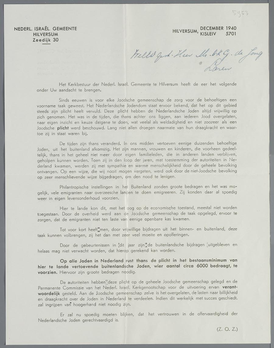Brieven (7) van het Comite voor Steun aan D.K.G de Jong m.b.t. hulp aan in Nederland verblijvende buitenlandse joden, 1940