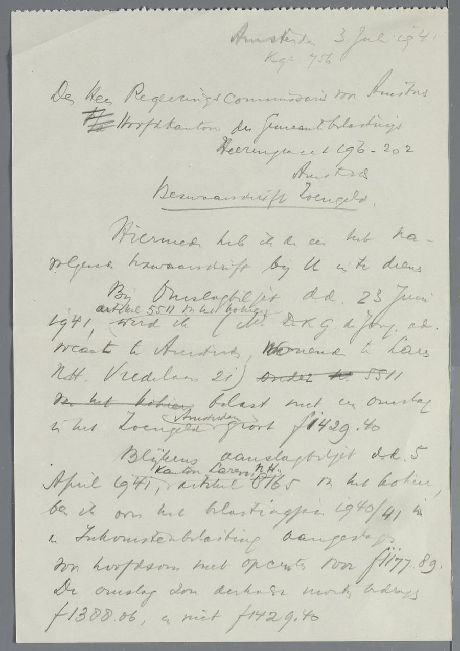 Concept bezwaarschrift aangaande zoengeld (boete) te betalern i.v.m. Februaristaking, juli 1941