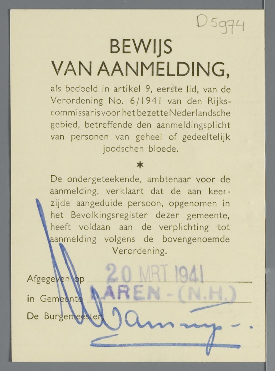Aanmeldingsbewijs voor personen van geheel of gedeeltelijk joodsche bloede, op naam van D.K.G. de Jong, 1941