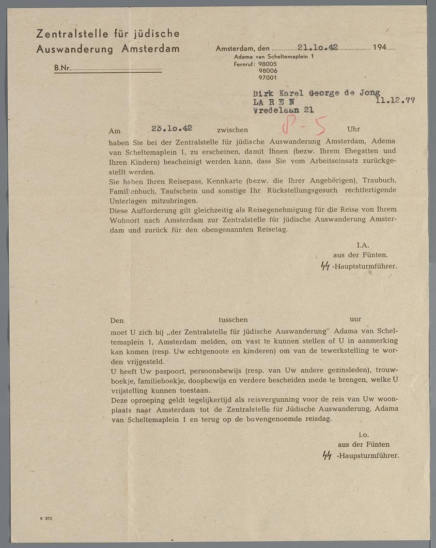 Oproep voor advocaat D.K.G. de Jong in Laren om naar de Joodse Raad in Amsterdam te komen in verband met vrijstelling twerkstelling, oktober 1942