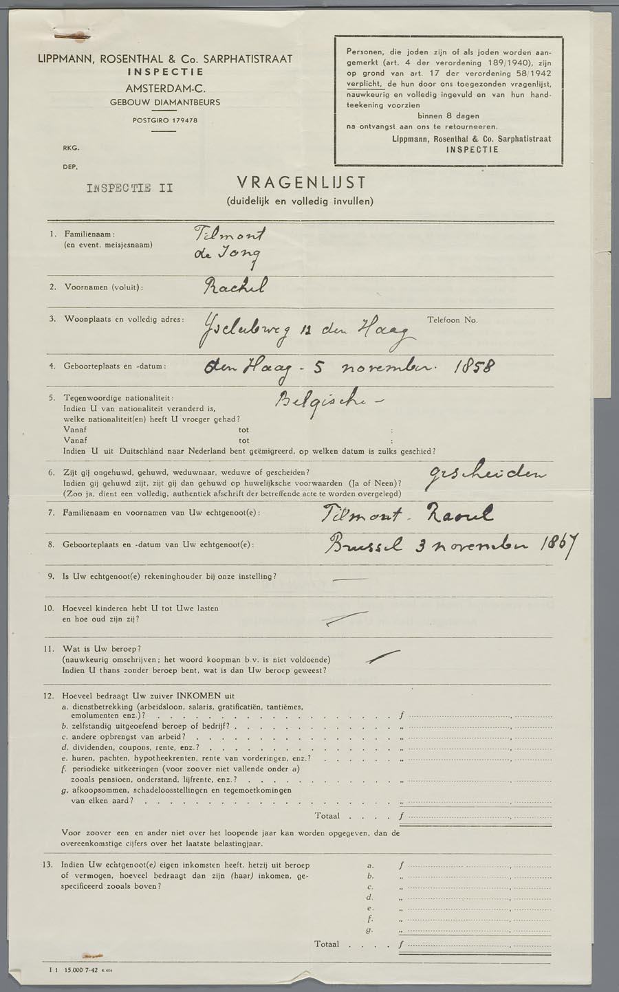 Vragenlijst v. Lippmann, Rosenthal & Co. betreffende financiën en vermorgen, op naam van mw. Rachel Tilmont-de Jong, (+ begeleidend schrijven), circa 1942