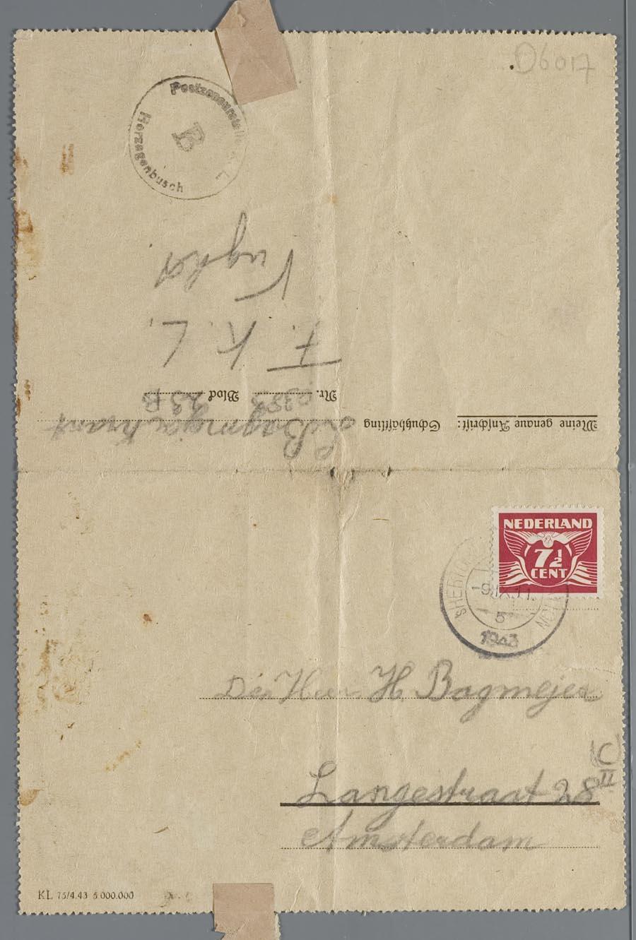 Brieven (6) van Lena Bagmeijer-Krant aan haar familie vanuit het concentratiekamp Vught, circa 1943-1944