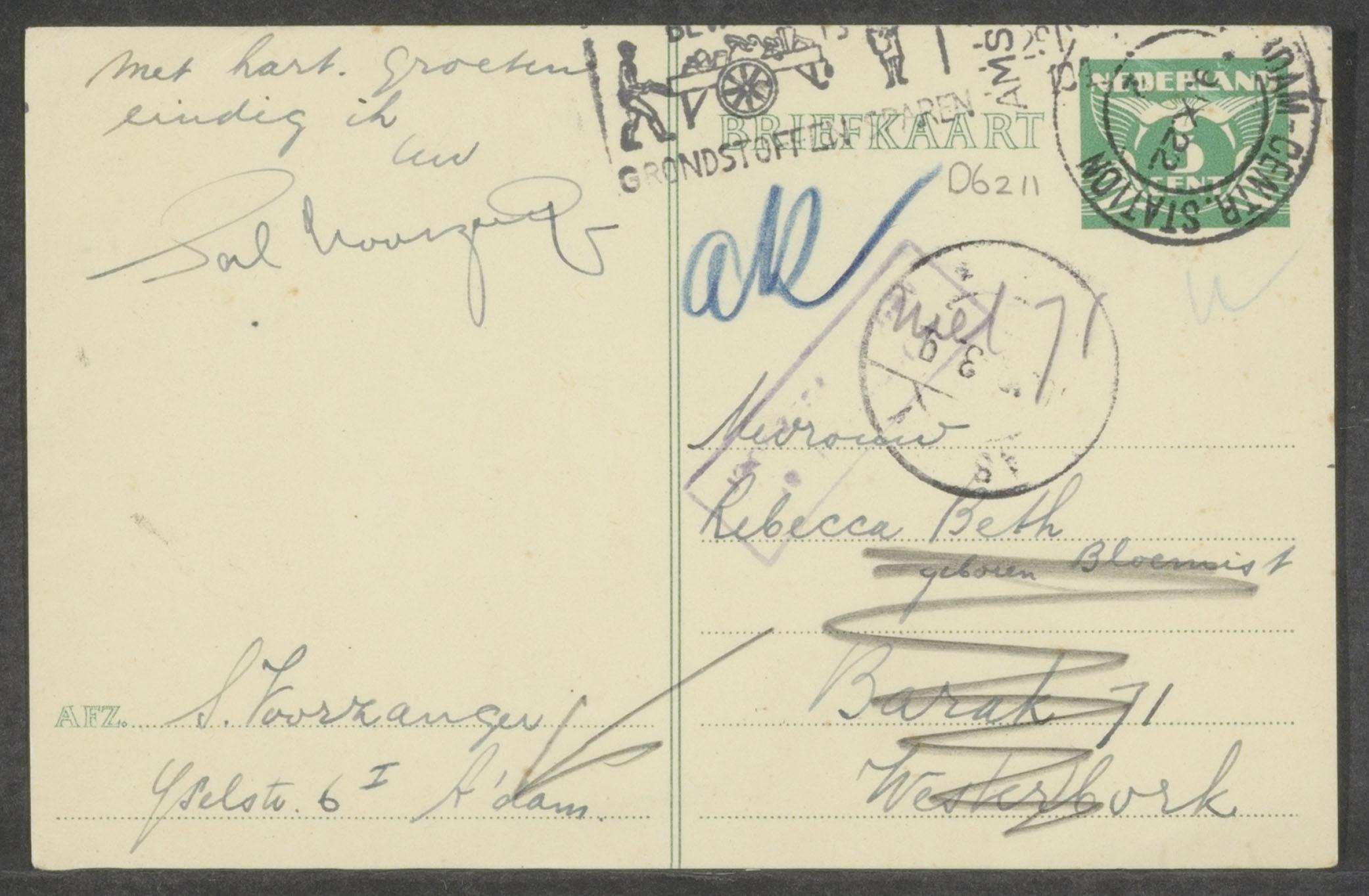 Briefkaart (2) van Salomon Voorzanger aan Rebecca Beth-Bloemist in Westerbork, bestemd voor Jaap, Emmy en Loutje Voorzanger, 1943