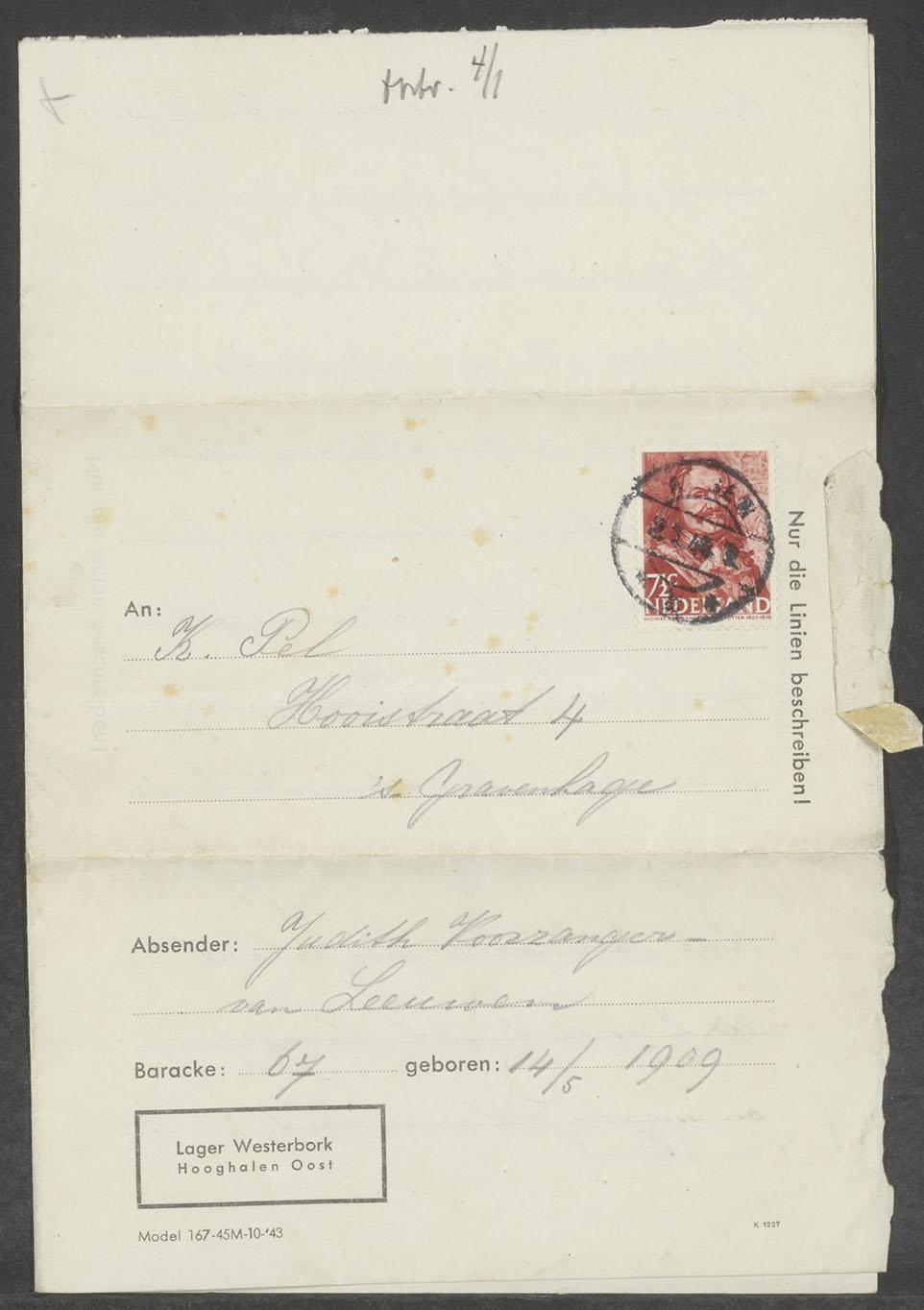 Brief van Judith Voorzanger-van Leeuwen vanuit Westerbork aan K. Pel in Den Haag, 1943