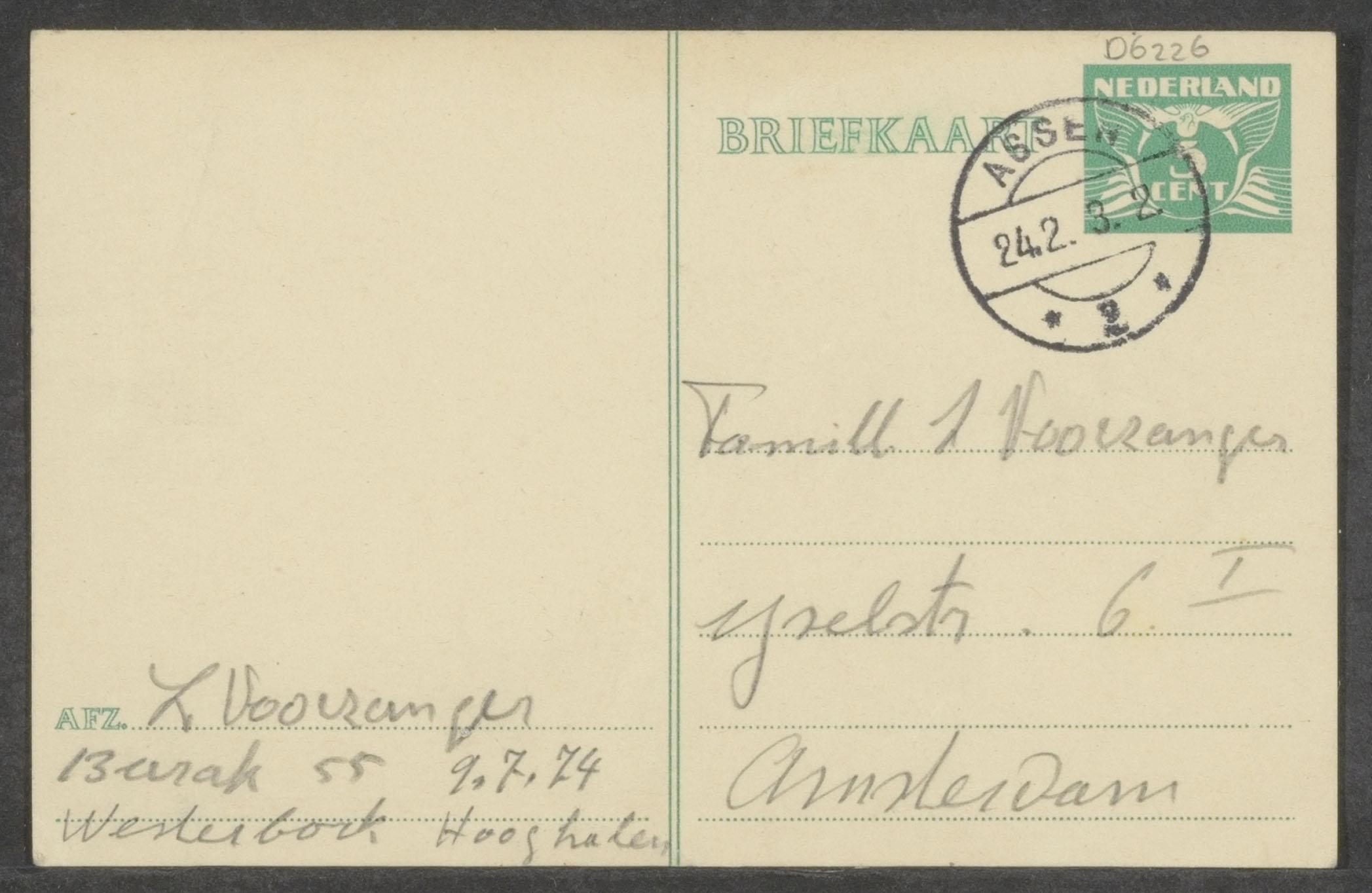 Briefkaart (3) van Louis Voorzanger in Westerbork aan Salomon Voorzanger in Amsterdam, ter bevestiging ontvangst pakketten in Westerbork 1943