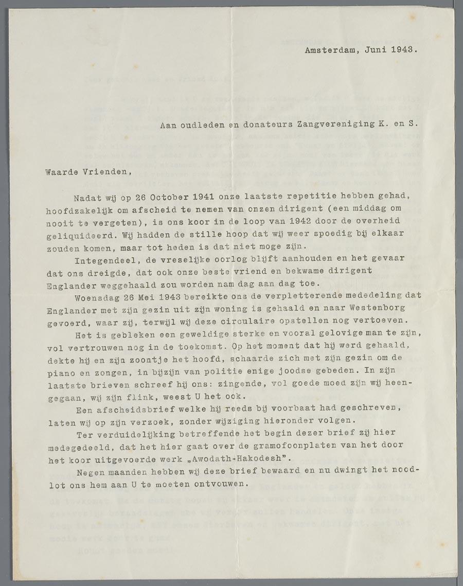 Afscheidsbrief van S.H. Englander aan dhr. Kuil met begeleidend schrijven aan oud-leden v.d. zangvereniging Kunst en Strijd, 1942 en 1943