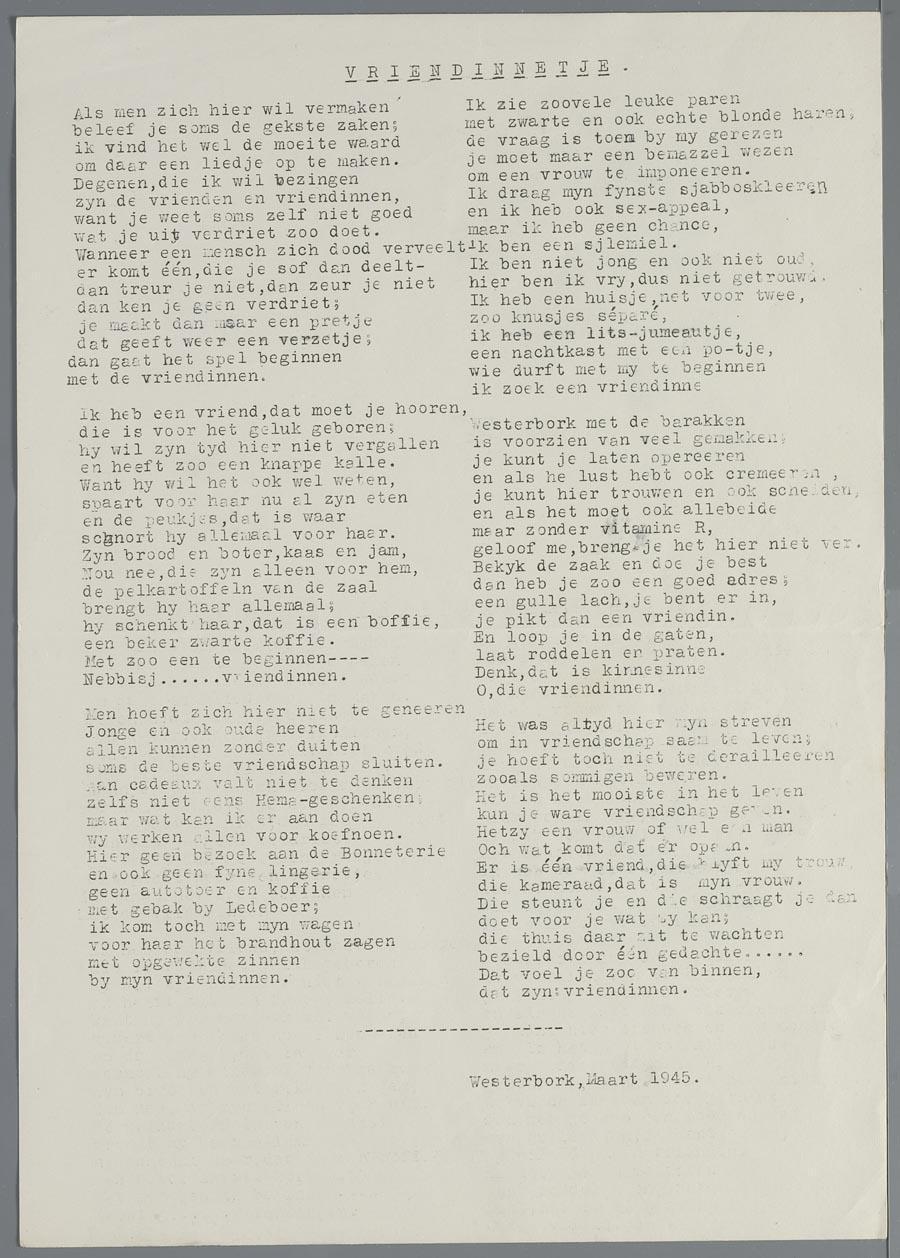 Gestencilde liederen met de titels: 'Vriendinnetje', 'Westerbork mij ook een zorg', 'Zelfvertrouwen' (allen met tekst van I. van Nierop) en een aantal bekende Nederlandse liederen.