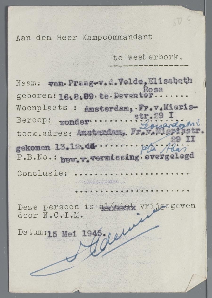 Betrouwbaarheidsverklaring voor Elisabeth Rosa van Praag-van der Velde, gericht aan de kampcommandant van Westerbork. De N.C.I.M. had mevr. van Praag-van der Velde 'vrijgegeven', mei 1945