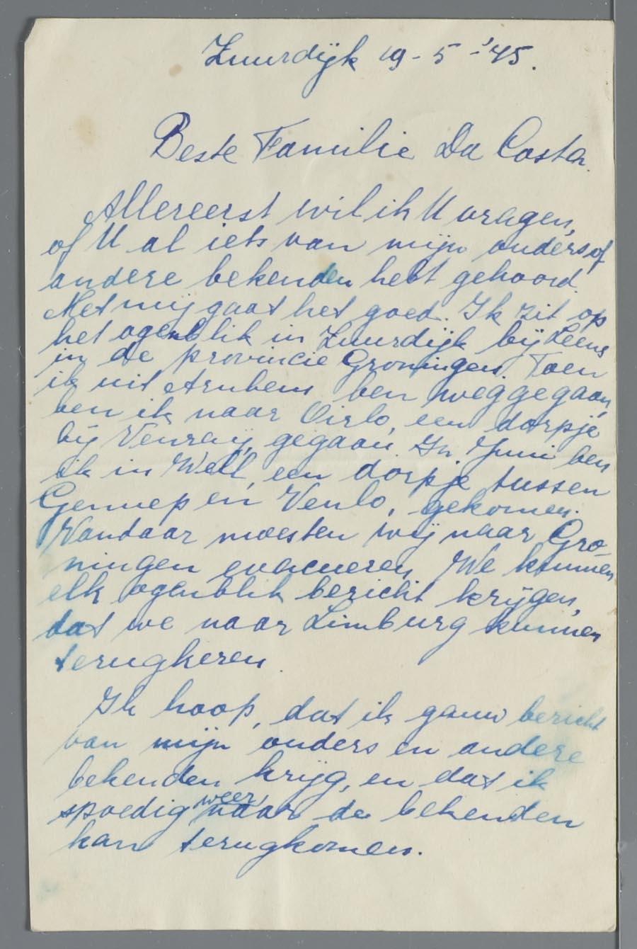 Judith Schorlesheim stuurt deze briefkaart vanuit Zuurdijk waar ze bij de familie Derks verblijft, vlak na de bevrijding aan de familie Da Costa in Amsterdam, op 19 mei 1945. Ze vertelt over haar verschillende onderduikadressen en schrijft: "Ik hoop dat ik gauw bericht van mijn ouders en andere bekenden krijg, en dat ik spoedig weer naar de bekenden kan terugkomen". Haar ouders Michel Schorlesheim en Marianne Schorlesheim-Konijn waren vermoord in Sobibor, op 2 juli 1943. Op het adres Johannes Vermeerstraat 9 woonden in 1940 H.I. en A.J. da Costa. Toegevoegd is een notitie met de namen Michel Schorlesheim en Marianne Schorlesheim-Konijn, met de nummers van barak en bed.