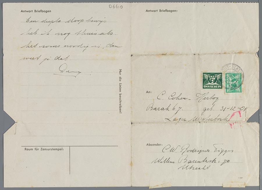 Brief van Corrie W. Rodrigues-Tigges aan Celina Cohen-Hertog in Westerbork, 1944