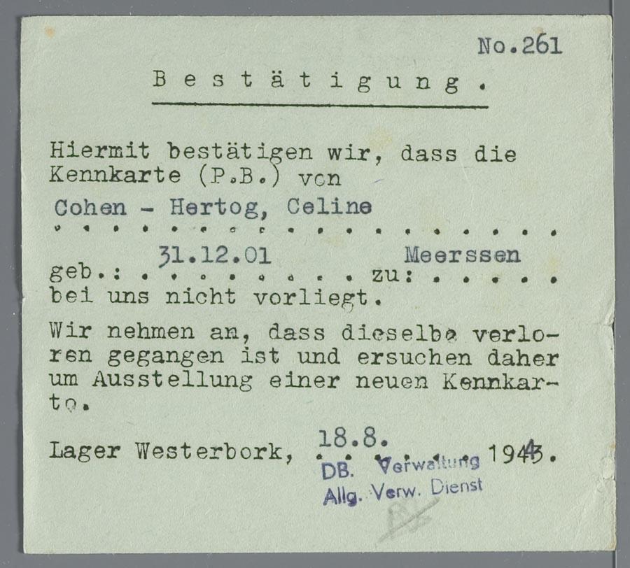 Verklaring dat het persoonsbewijs van Celine Cohen-Hertog niet in Westerbork is, 1944
