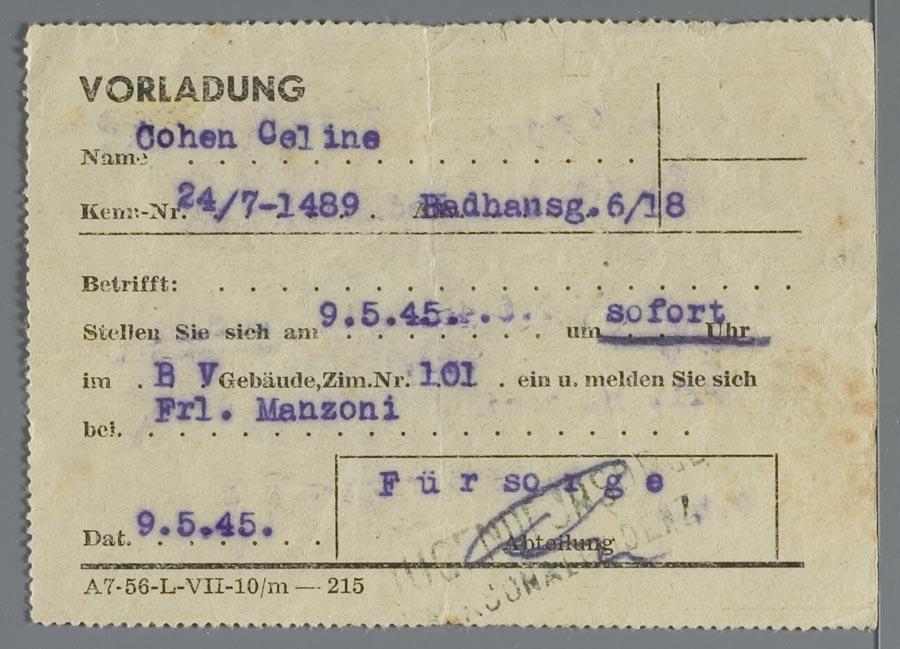 Oproepen voor Celine Cohen om zich voor arbeid te melden, Theresienstadt, 1944-1945