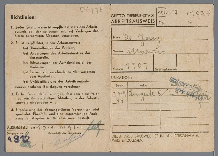 Identiteitsbewijs t.n.v Marcus de Jong, Theresienstadt, 1944