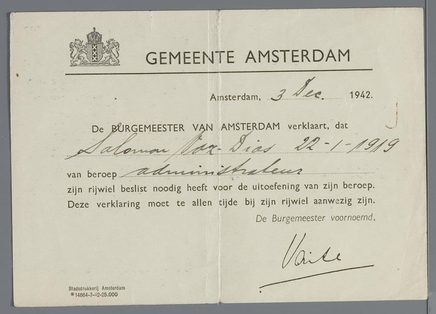 Verklaring van Gemeente Amsterdam dat S. Vaz Dias voor de uitoefening van zijn beroep zijn rijwiel nodig heeft, december 1942