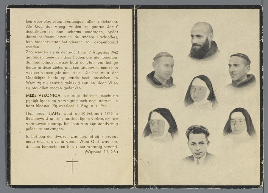 Bidprentje met zeven leden van de tot het katholicisme bekeerde familie Löb, omgekomen in Auschwitz, 1945