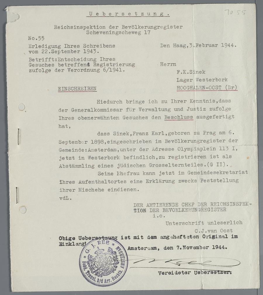 In deze duitstalige verklaring van de Rijksinspectie van de Bevolkingsregistratie, getekend door C.J. van Oost, wordt gesteld dat Franz Karl Sinek maar één joodse grootouder heeft - en dat zijn joodse vrouw hiermee dus gemengd gehuwd is, d.d 3 februari 1944