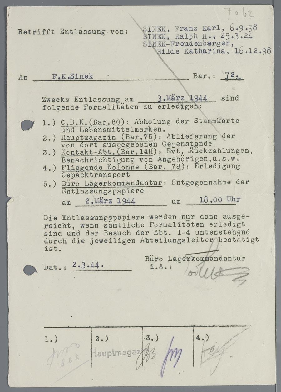 Formulier over de vrijlating van de familie Sinek uit Westerbork, Westerbork, maart 1944