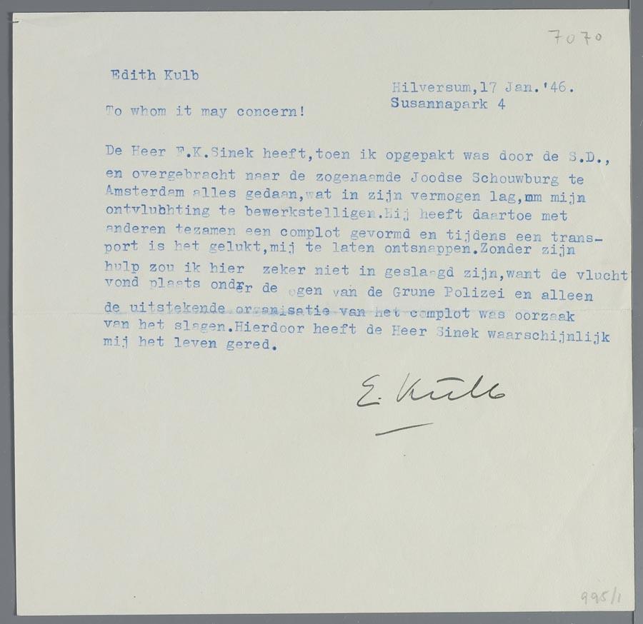 Verklaring van Edith Kulb dat zij dankzij Franz Sinek heeft kunnen ontsnappen uit de Hollandsche Schouwburg, nadat zij was opgepakt door de SD, 17 januari 1946