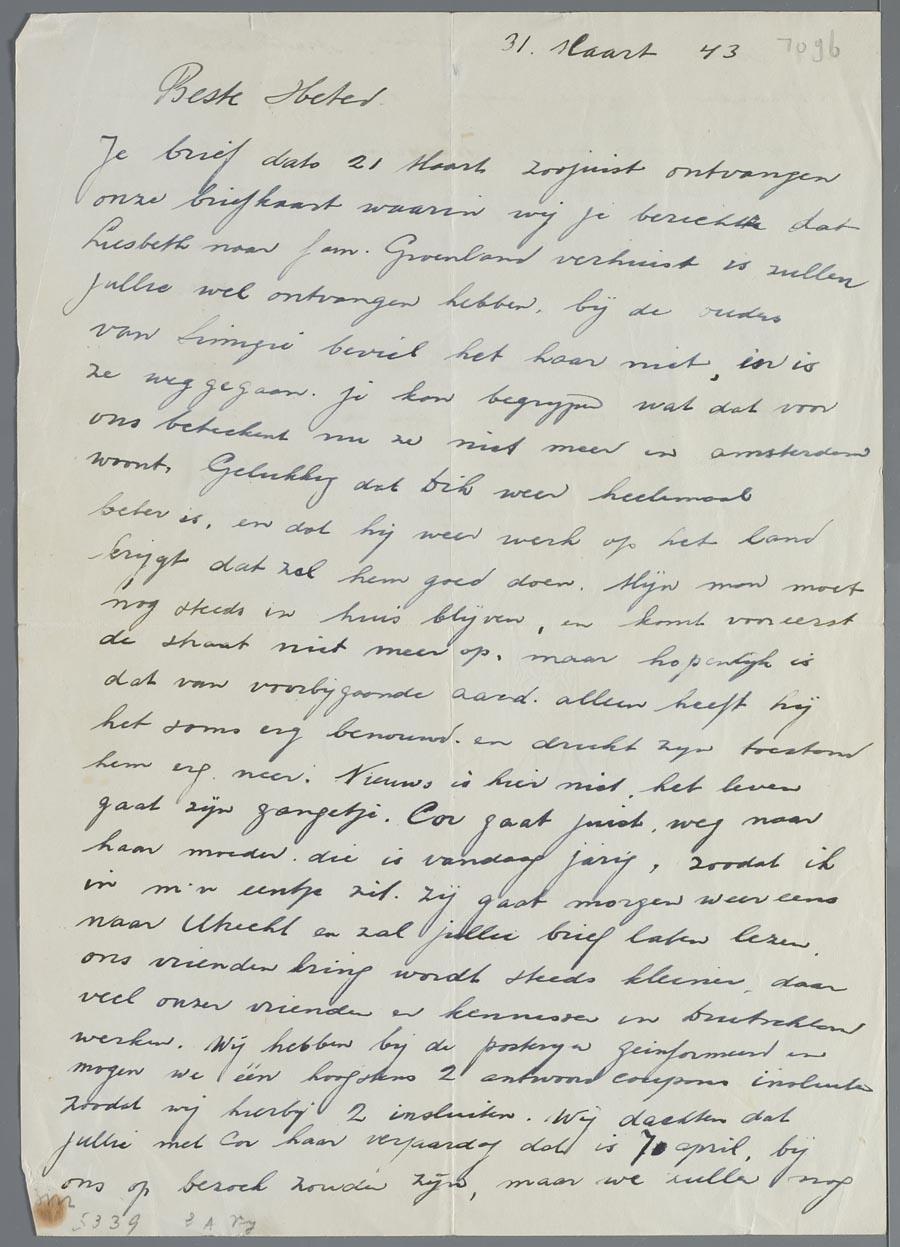 Brief aan Hetty en Eduard van Vriesland tijdens hun ballingschap in Zwitserland, maart 1943
