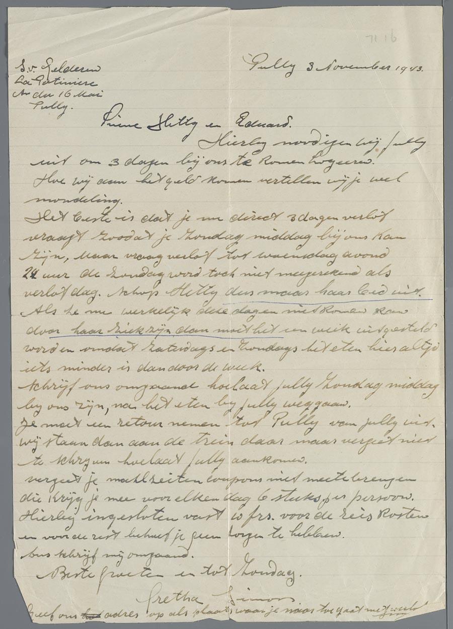 Brief van Gretha en Simon van Gelderen in Pully aan Hetty en Eduard van Vriesland tijdens hun ballingschap in Zwitserland, november 1943