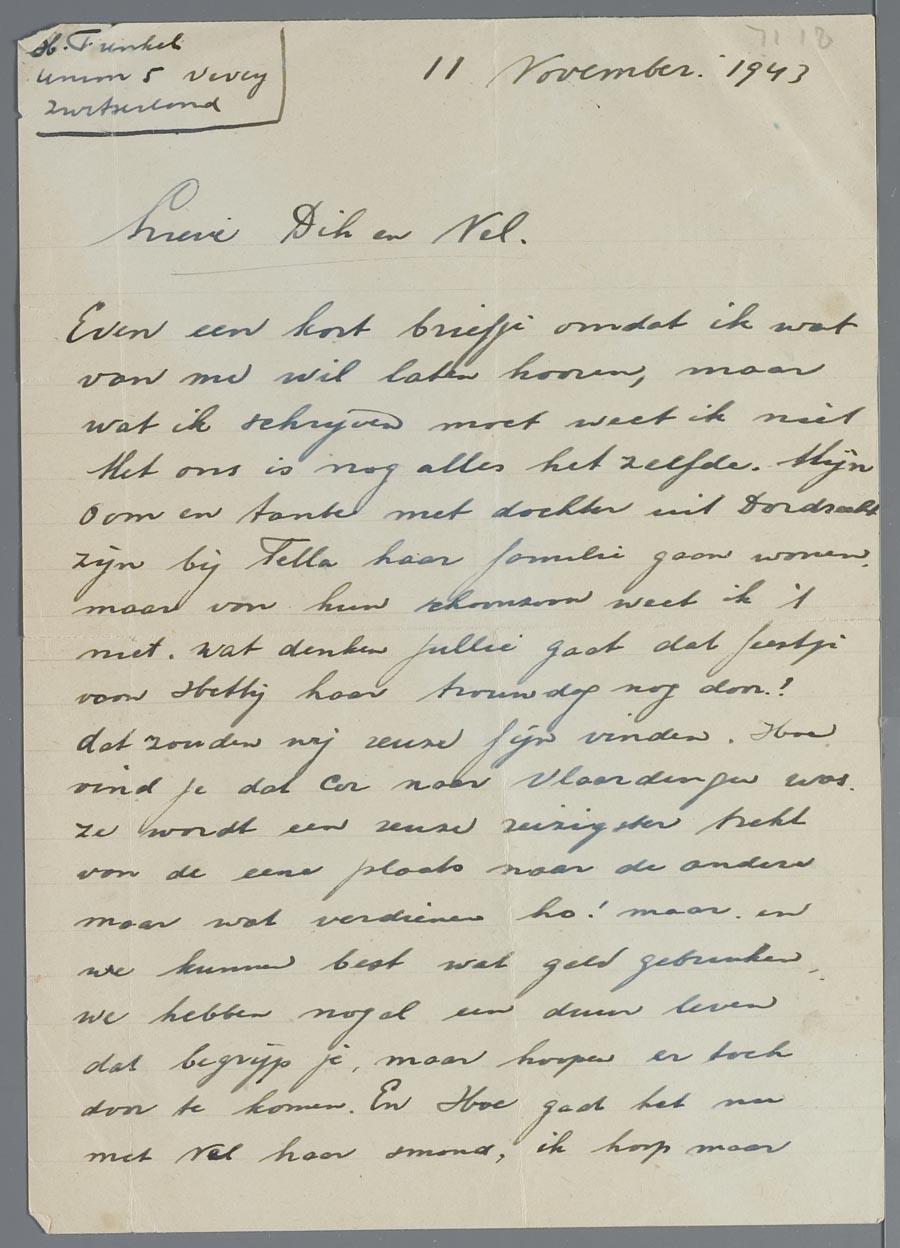Een brief aan Hetty en Eduard van Vriesland tijdens hun ballingschap in Zwitserland, d.d. 11 november 1943.