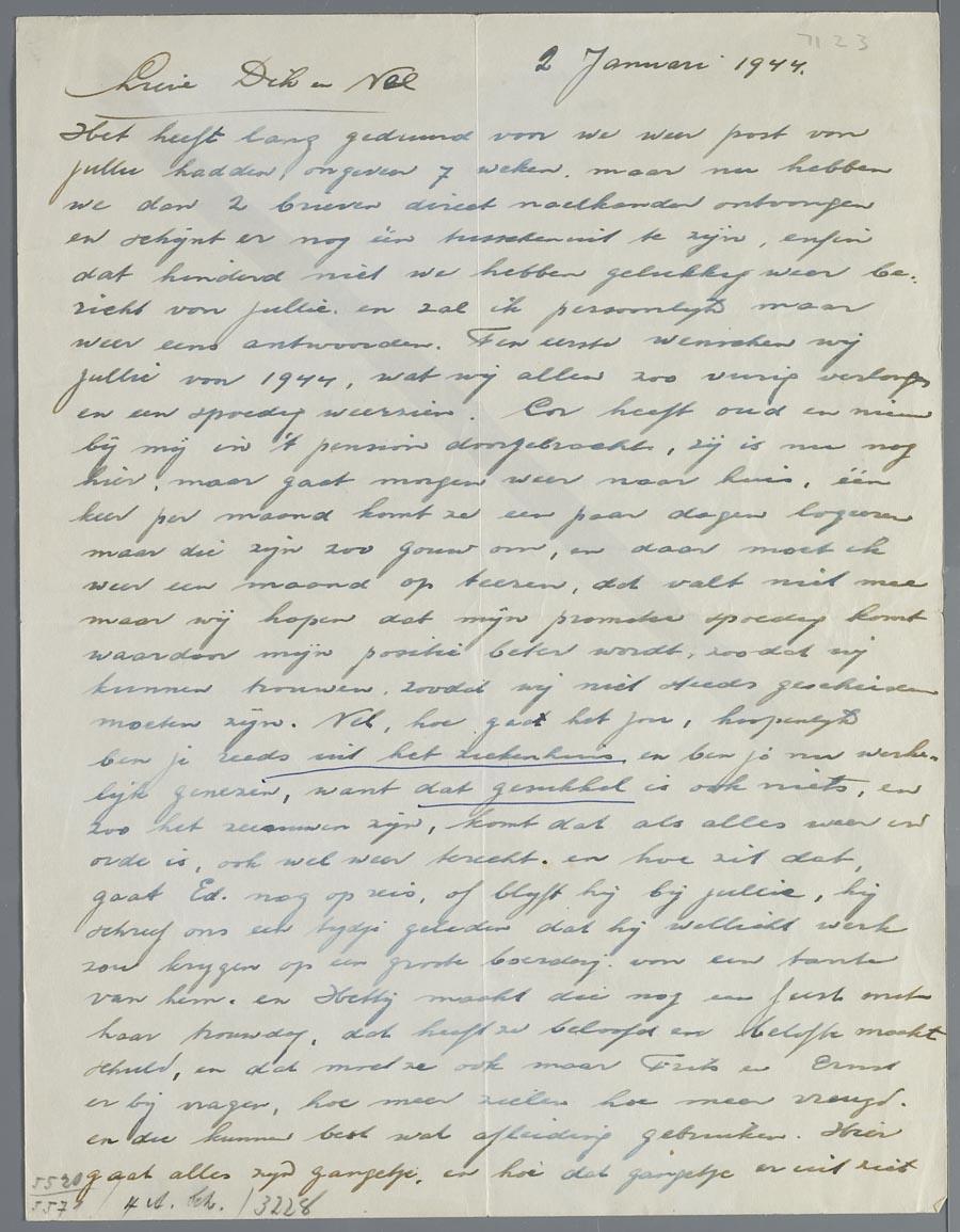 Brief aan Hetty en Eduard van Vriesland tijdens hun ballingschap in Zwitserland, januari 1944