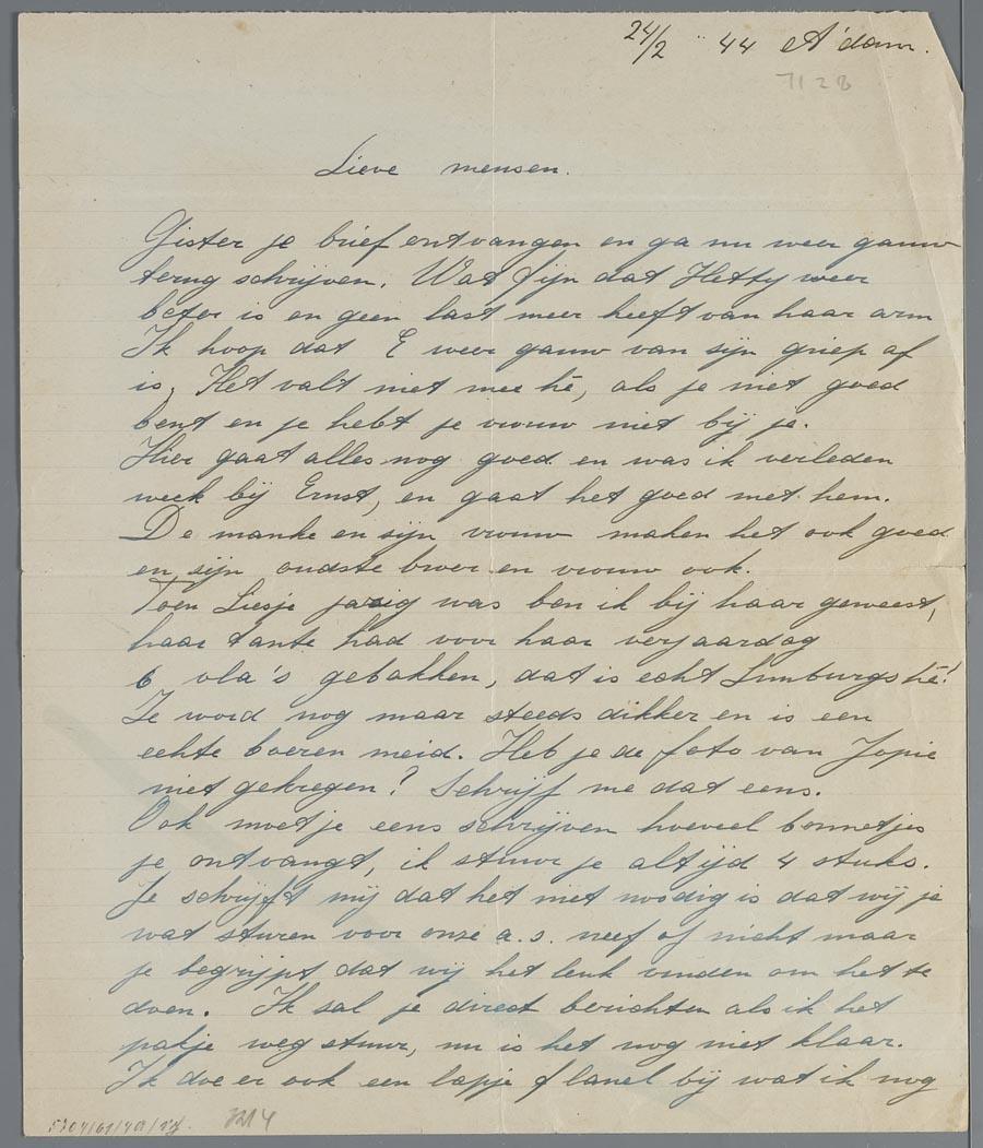 Brief aan Hetty en Eduard van Vriesland tijdens hun ballingschap in Zwitserland, februari 1944
