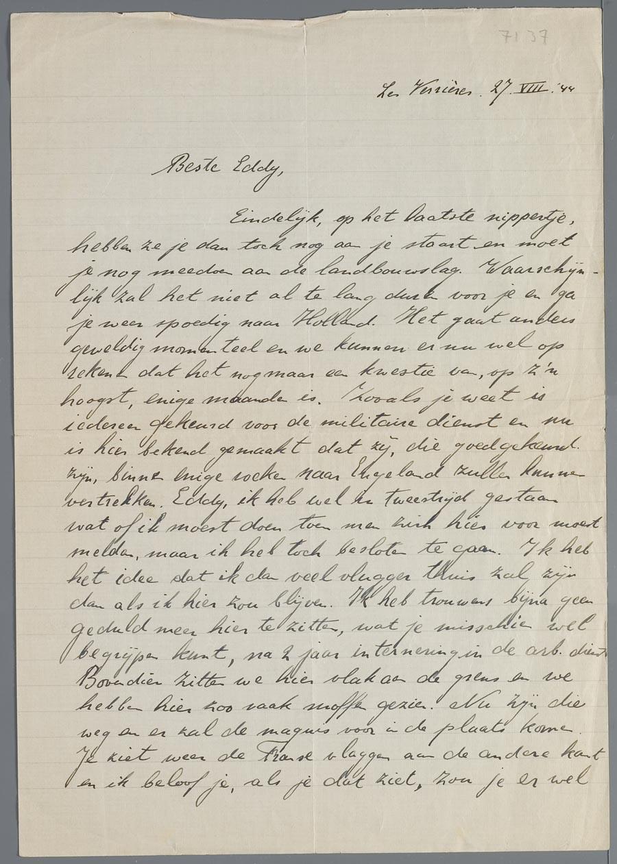 Brief van 'Leo' aan Eduard van Vriesland tijdens zijn ballingschap in Zwitserland, augustus 1944