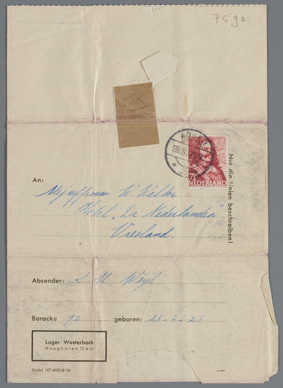 Brief uit Westerbork van Sara Margot Weijl (26-6-1926) aan Willy Welter in Vreeland, augustus 1944