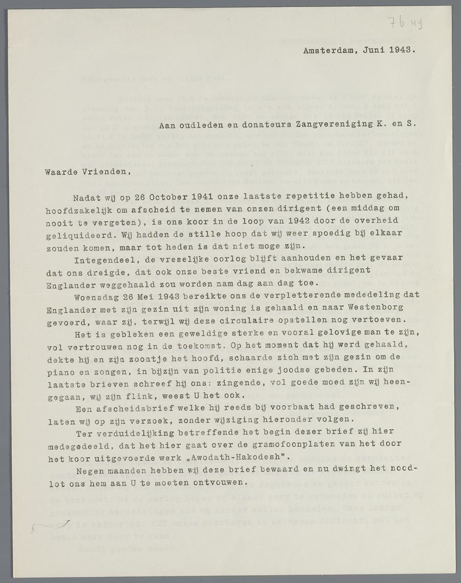 Circulaire aan de oudleden en donateurs van de zangvereniging "Kunst en Strijd" over de afscheidsbrief die dirigent S.H. Englander al in september 1942 heeft geschreven aan voorzitter Kuil en die nu aan de leden wordt meegestuurd, juni 1943