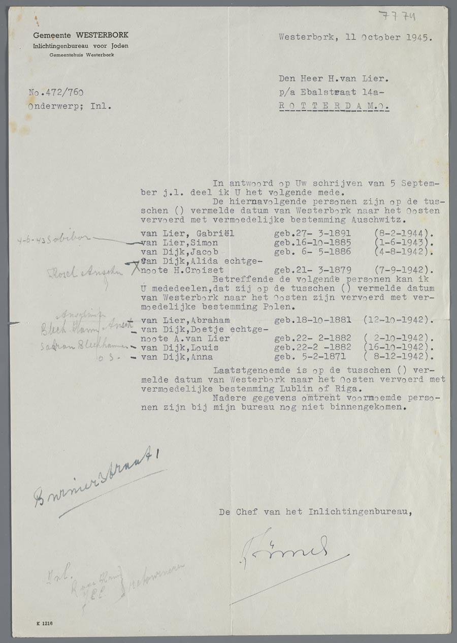 Brief van de Gemeente Westerbork met betrekking tot de deportatiedata van de families Van Lier en Van Dijk, 1945
