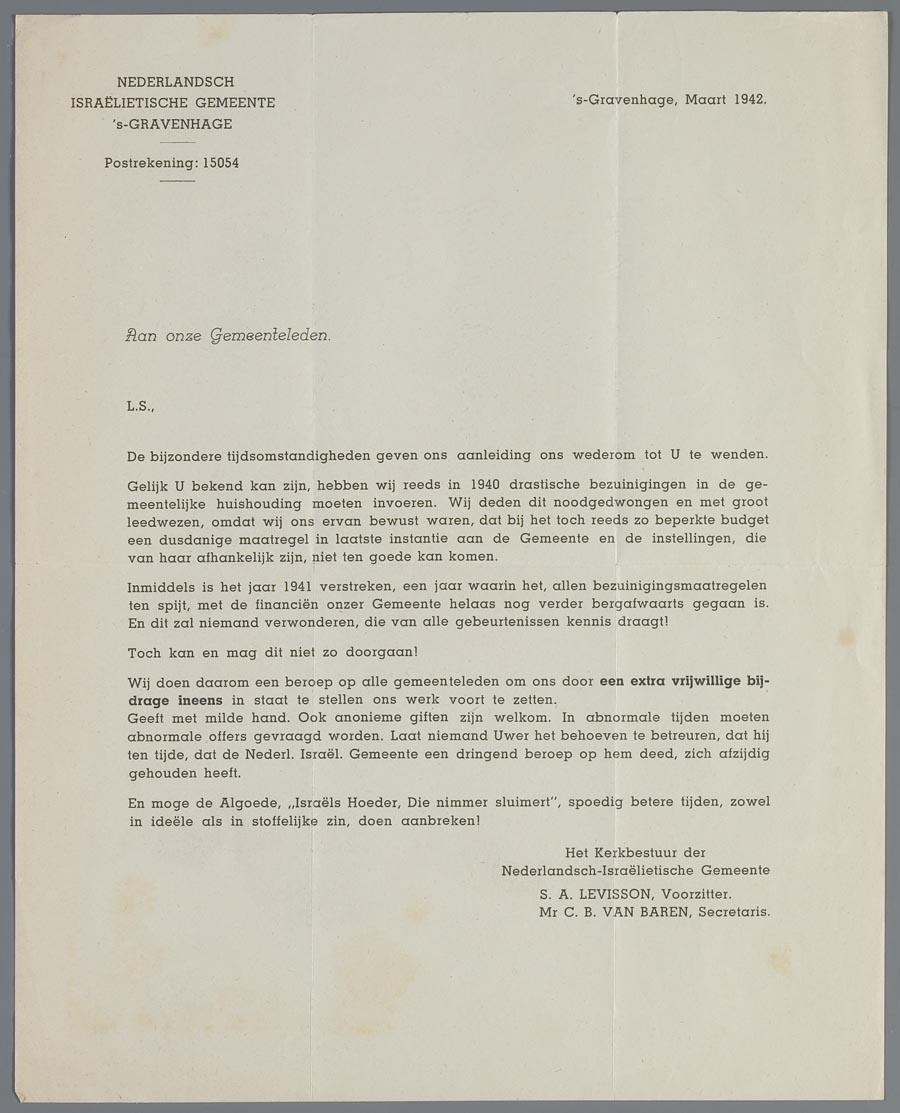 Circulaire van de Ned. Isr. Gemeente Den Haag gericht aan de Wed. H. Wolff met verzoek om (extra) geldelijke steun, maart 1942