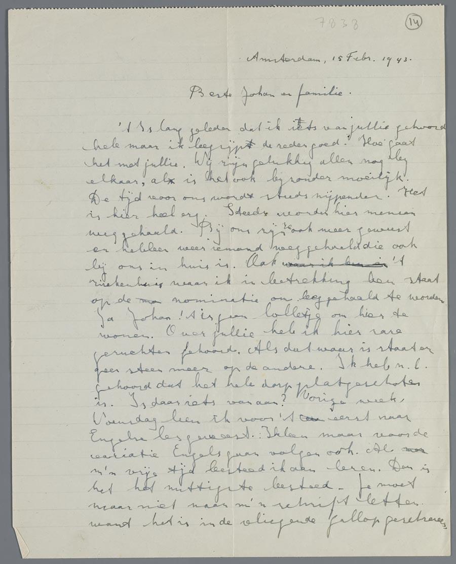 Brief uit Amsterdam van Ben Wessels aan Johan Schipper in Oostvoorne, februari 1943