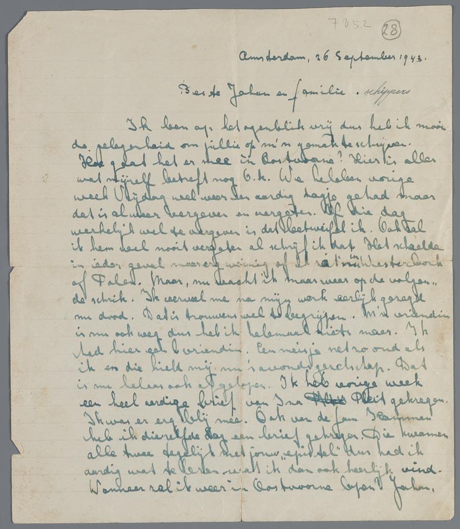 Brief uit Amsterdam van Ben Wessels aan Johan Schipper in Oostvoorne, september 1943