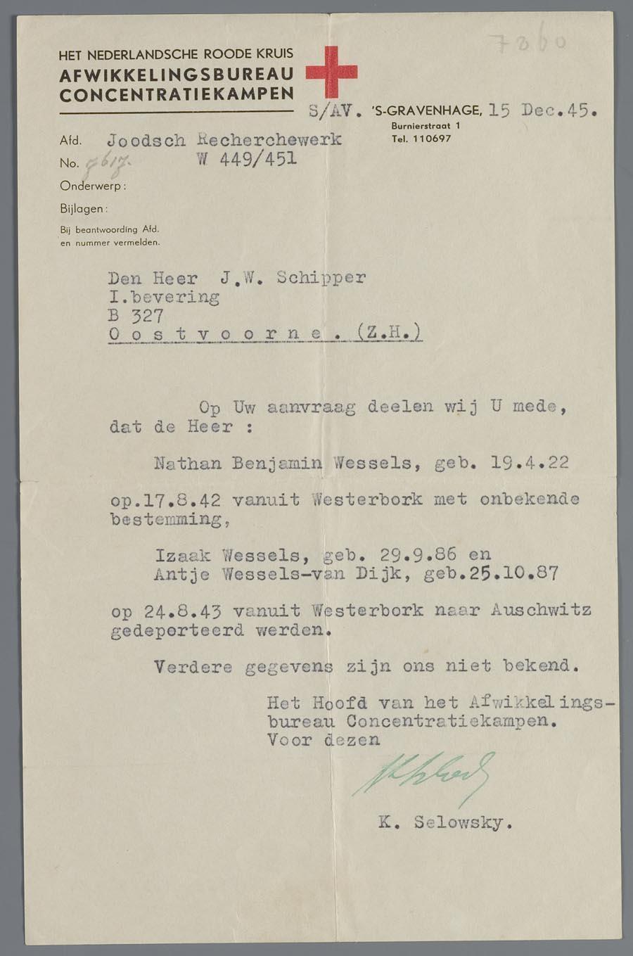 Brief van het Nederlandse Rode Kruis aan Johan Schipper, d.d. 15 december 1945, over de deportatie vanuit Westerbork van het echtpaar Izaak Wessels en Antje Wessels-van Dijk en hun zoon Nathan Benjamin Wessels. Johan Schipper was goed bevriend met hun andere zoon, Benjamin Leo Wessels ('Ben').
