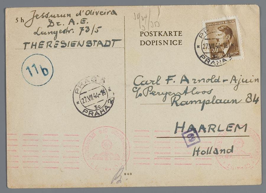 Briefkaart uit Theresienstadt van Dr. A.E. Jessurun d'Oliveira aan Carl F. Arnold in Haarlem, 1944