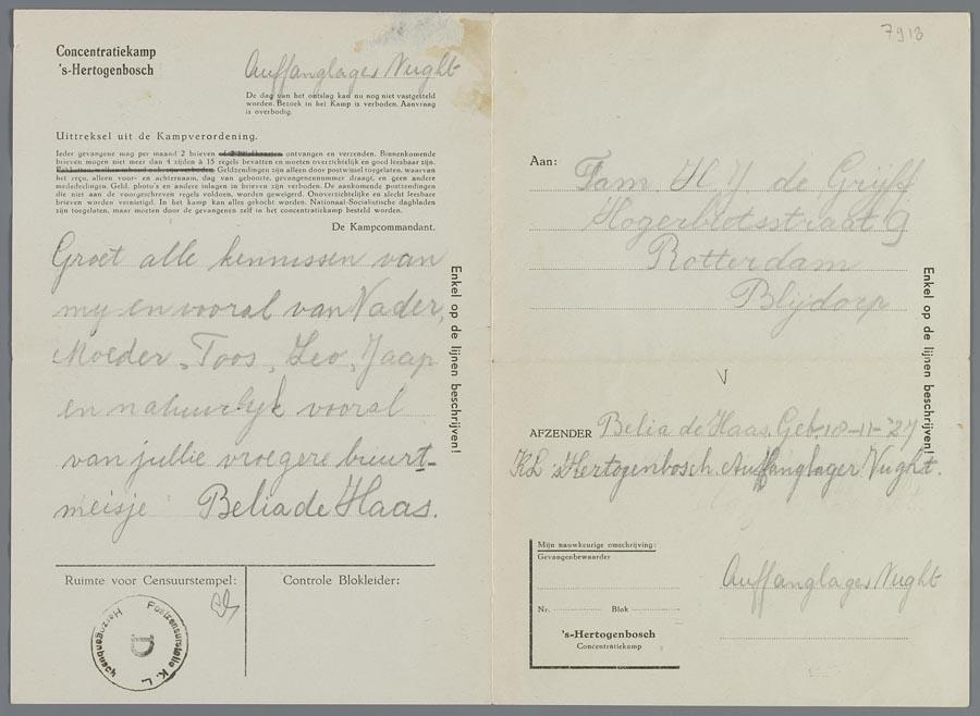 In november 1942 verhuisde Belia de Haas in het kader van de voor joden verplichte evacuatie van plaatsen in de provincie van Rotterdam naar Amsterdam. Hier kwam ze eerst in de Hollandsche Schouwburg terecht en na voorlopige vrijstelling bij kennissen in de Kraaipanstraat 63 in Amsterdam-Oost. Zij kwam op 28-5-1943 om in Sobibor. In de brief is verder sprake van To, Jaap en Leo. To is vermoedelijk haar zus Cato de Haas, Jaap is wellicht haar broer Jacob Menachem de Haas, en Leo is Leo Maurice de Haas.