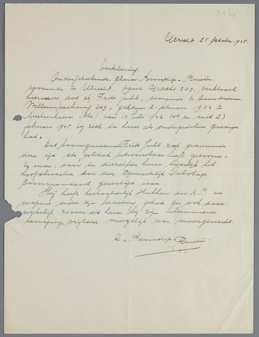 Verklaring van Clara Benschop-Rueter dat Frits Juhl bij haar in huis zat ondergedoken en actief was in het verzet, Utrecht, 1945