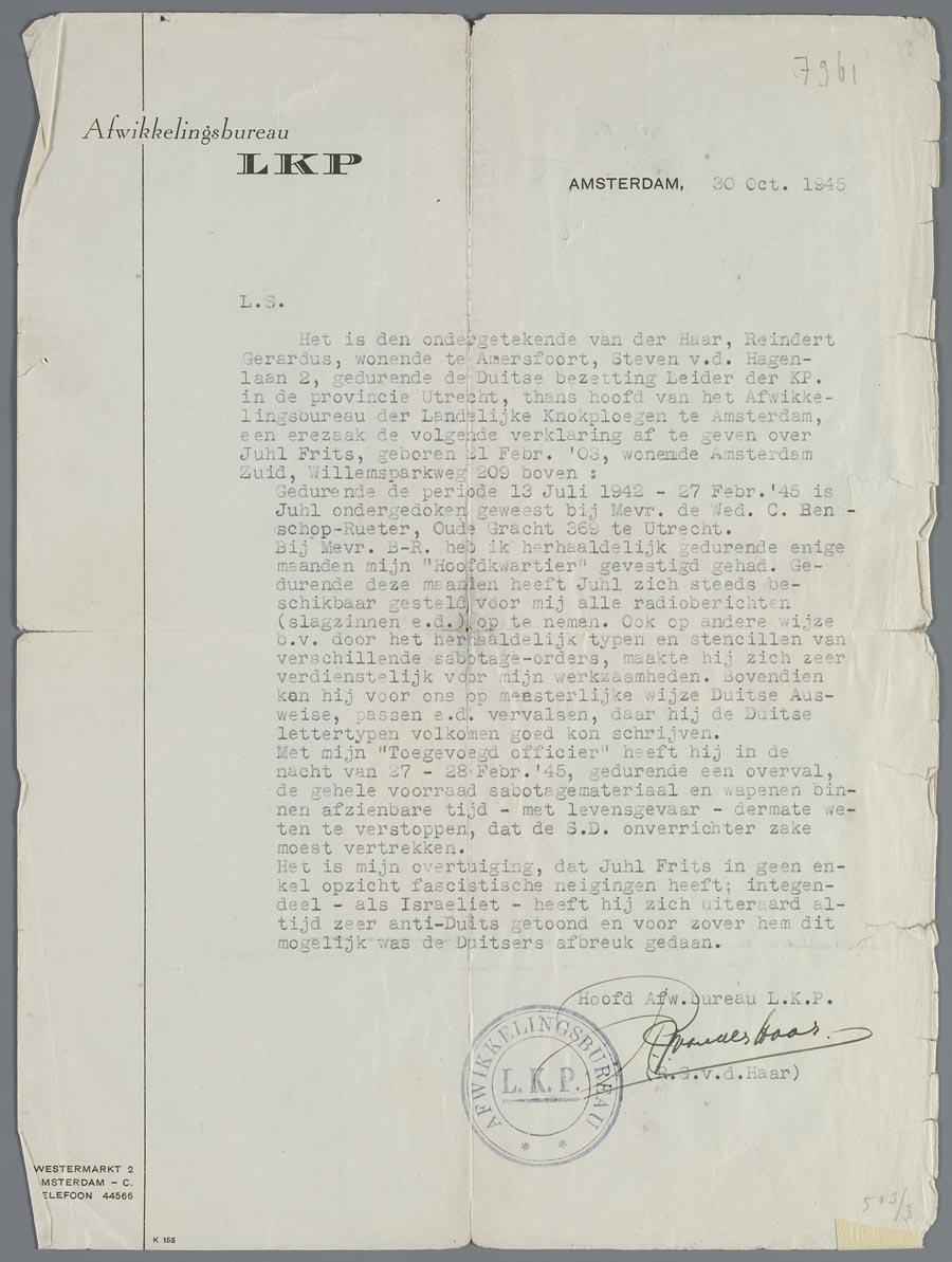Verklaring van Reindert Gerardus van der Haar van het Afwikkelingsbureau LKP dat Frits Juhl bij Clara Benschop-Rueter zat ondergedoken en actief was in het verzet, oktober 1945.