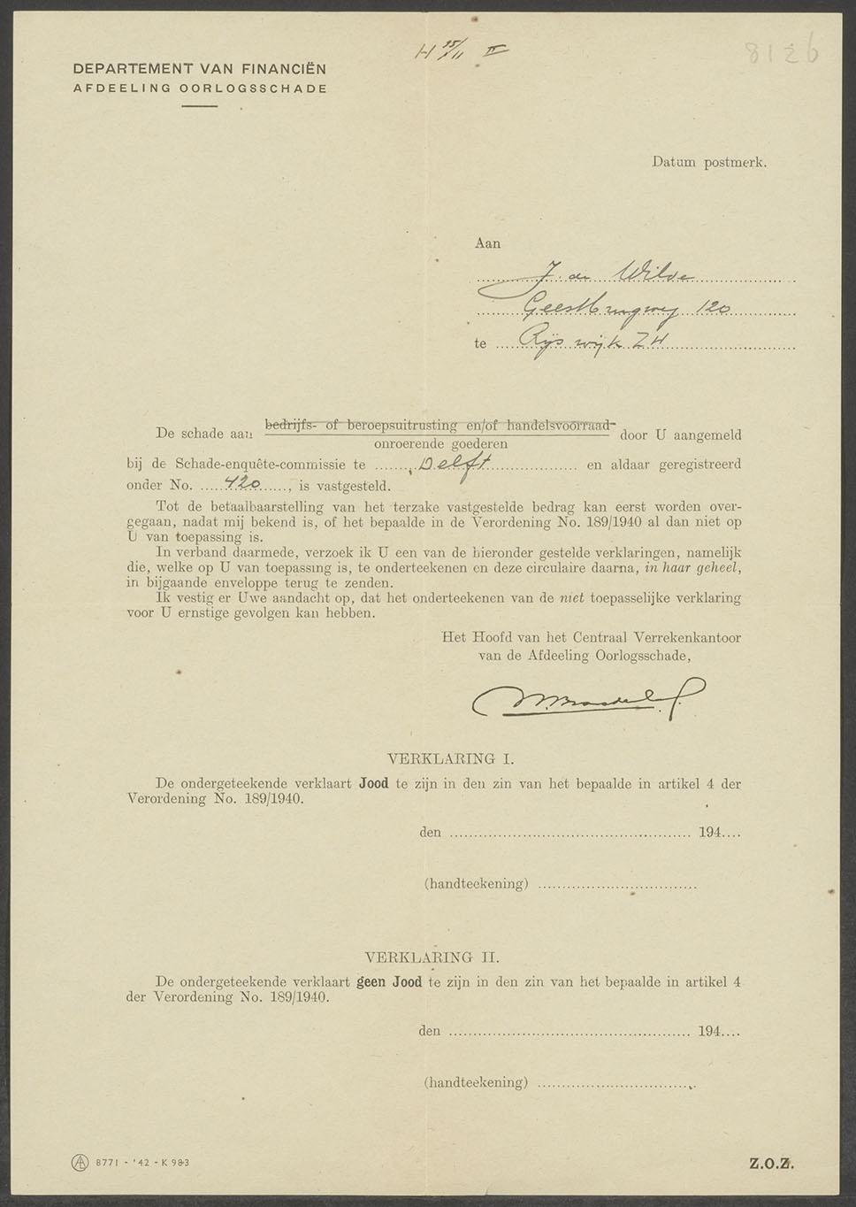 Niet-joodverklaring van de afdeling oorlogsschade van het Departement van Financien, 1940