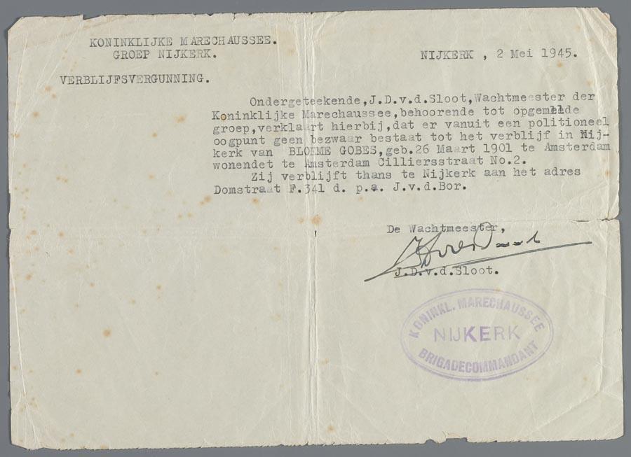 Verblijfsvergunning voor Nijkerk op naam van Bloeme Gobes, 2 mei 1945