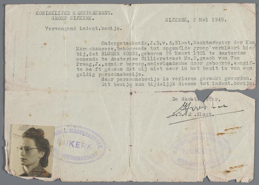 Aangifte van verlies persoonsbewijs en vervangend identiteitsbewijs van Bloeme Gobes, mei 1945