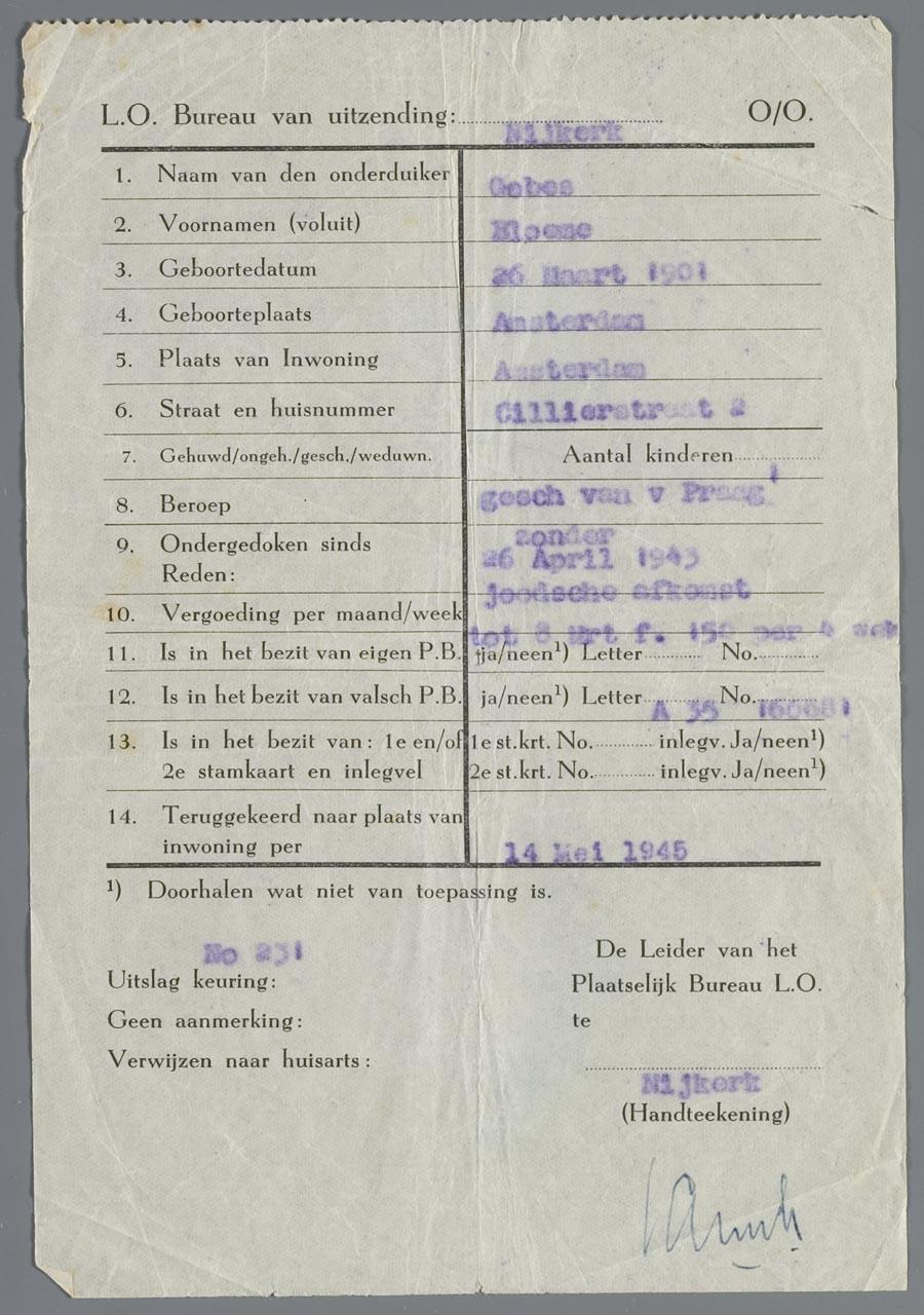 Registratie van Bloeme Gobes als opgedoken onderduiker, Nijkerk 1945